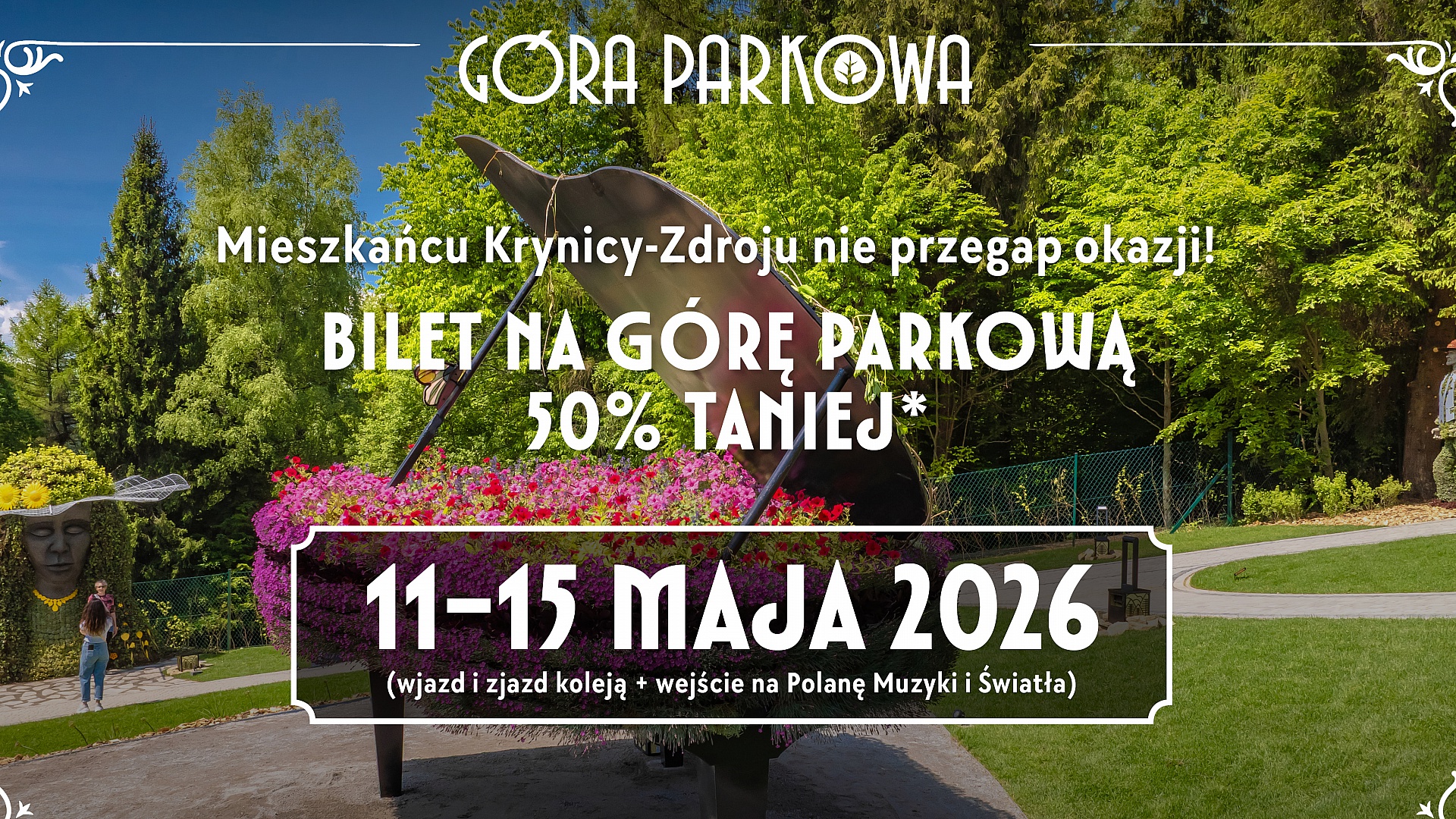 Dla mieszkańców przygotowaliśmy aż 50% zniżki na bilety na Kolej Linowo-Terenową (przejazd góra-dół) wraz z wejściem na Polanę Muzyki i Światła.