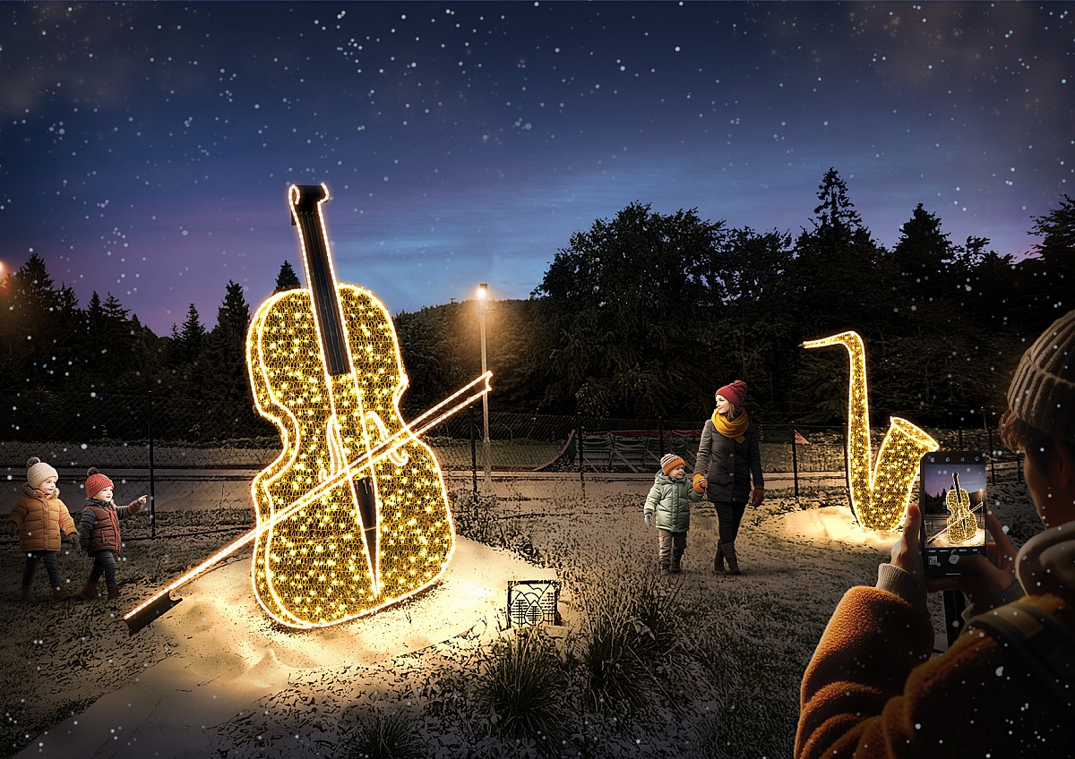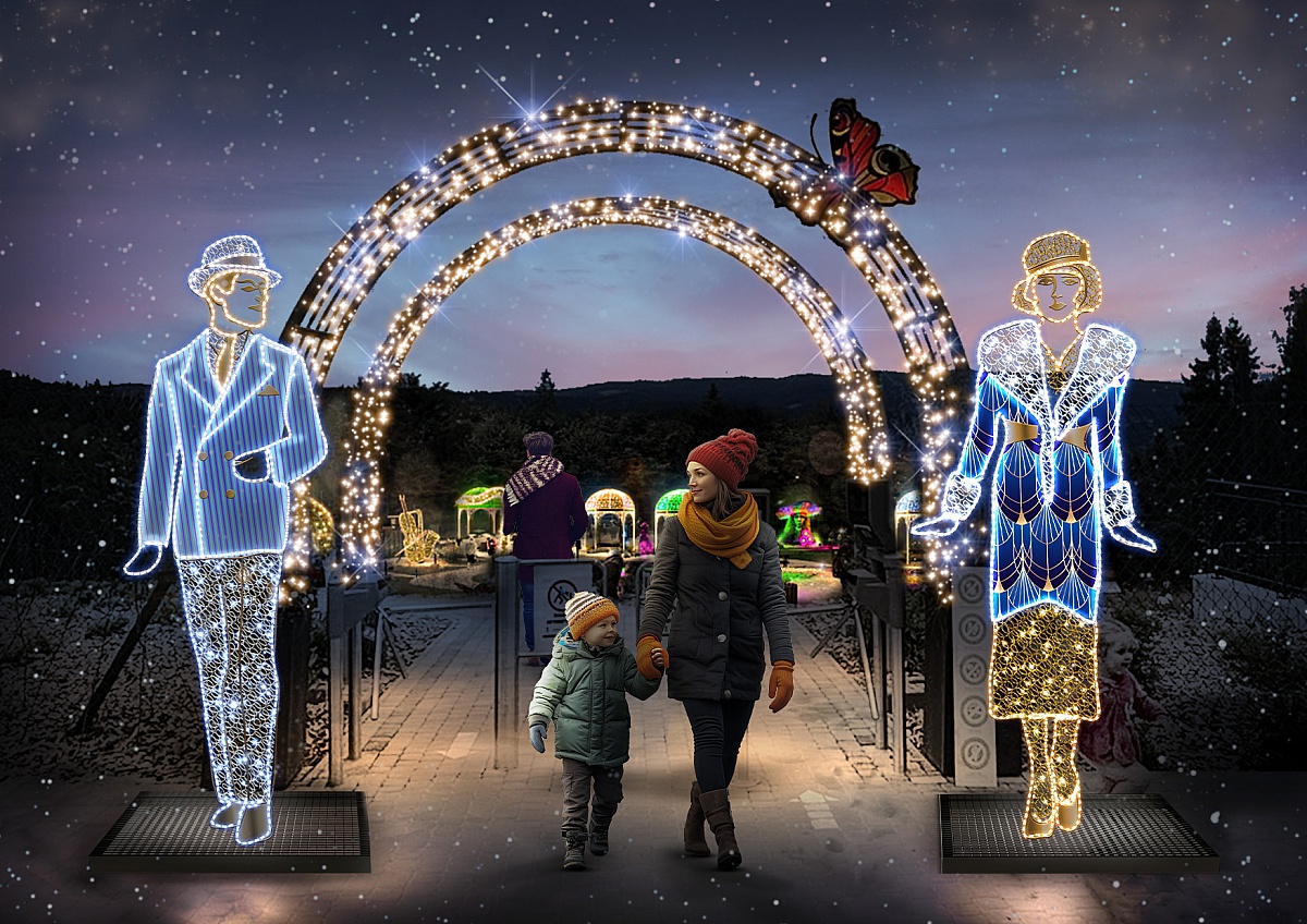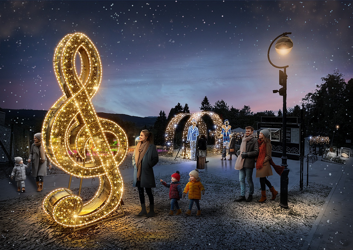 Zimowa Polana to ogród światła, w którym spacerujący już od 6 grudnia dostrzegą rozświetlone instrumenty muzyczne, pary w strojach z epoki, stylizowane altany czy subtelne formy inspirowane dźwiękiem i ruchem. Każdy z elementów został zaprojektowany w technologii energooszczędnych eco-LED, co pozwala uzyskać wyjątkowy efekt przy zachowaniu ekologicznej równowagi.