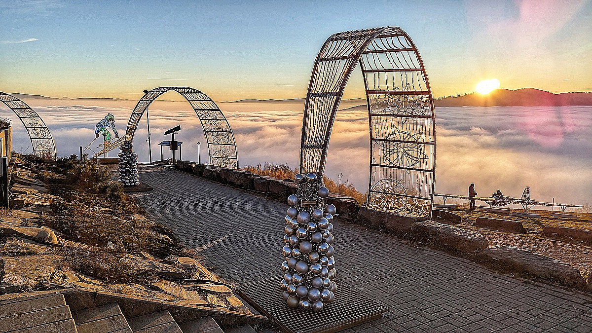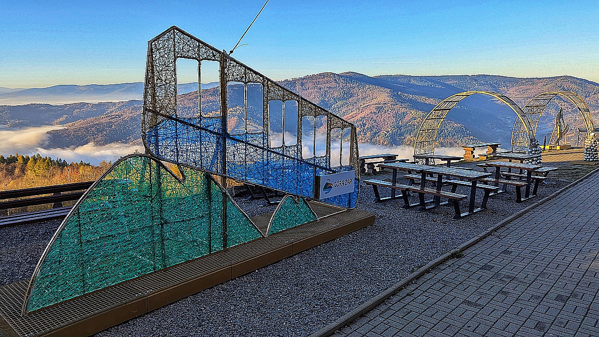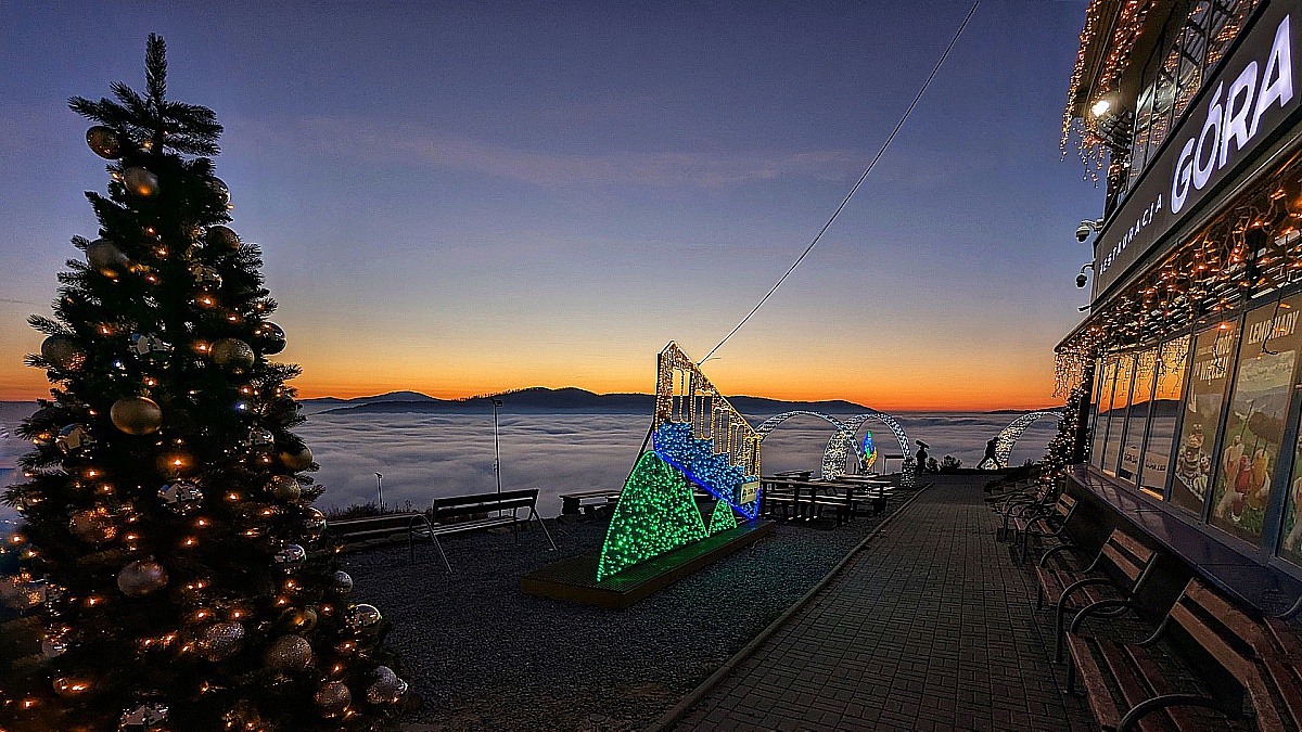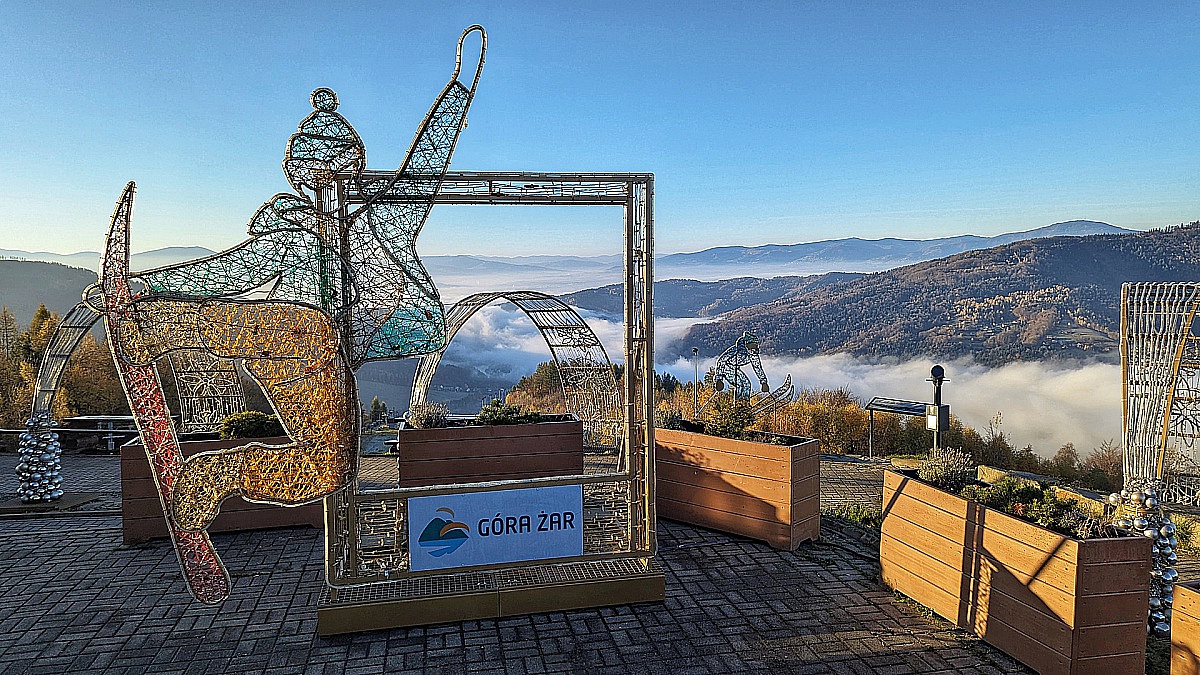 Admire an unforgettable spectacle of twinkling lights and luminous sculptures that shine among the autumn colors and the sea of clouds surrounding the summit of Mount Żar.