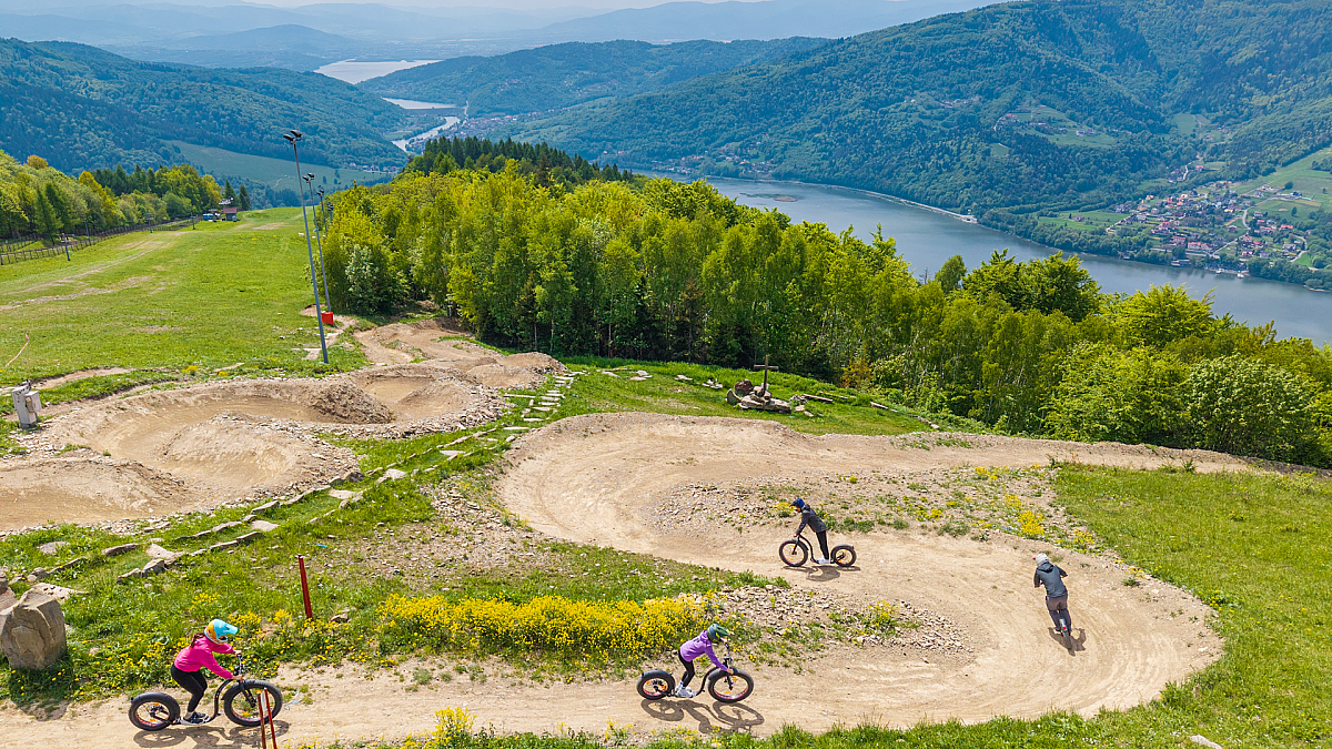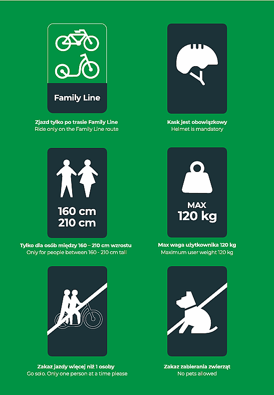 Uwaga na trasie Family Line można poruszać wyłącznie na dedykowanych hulajnogach dostępnych w wypożyczalni rowerowej PKL, bądź na rowerach downhillowych!