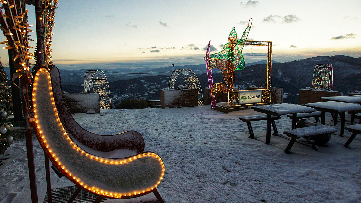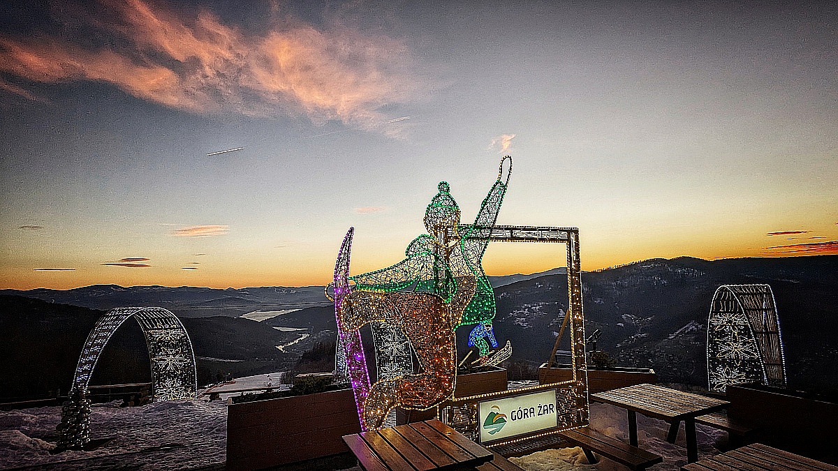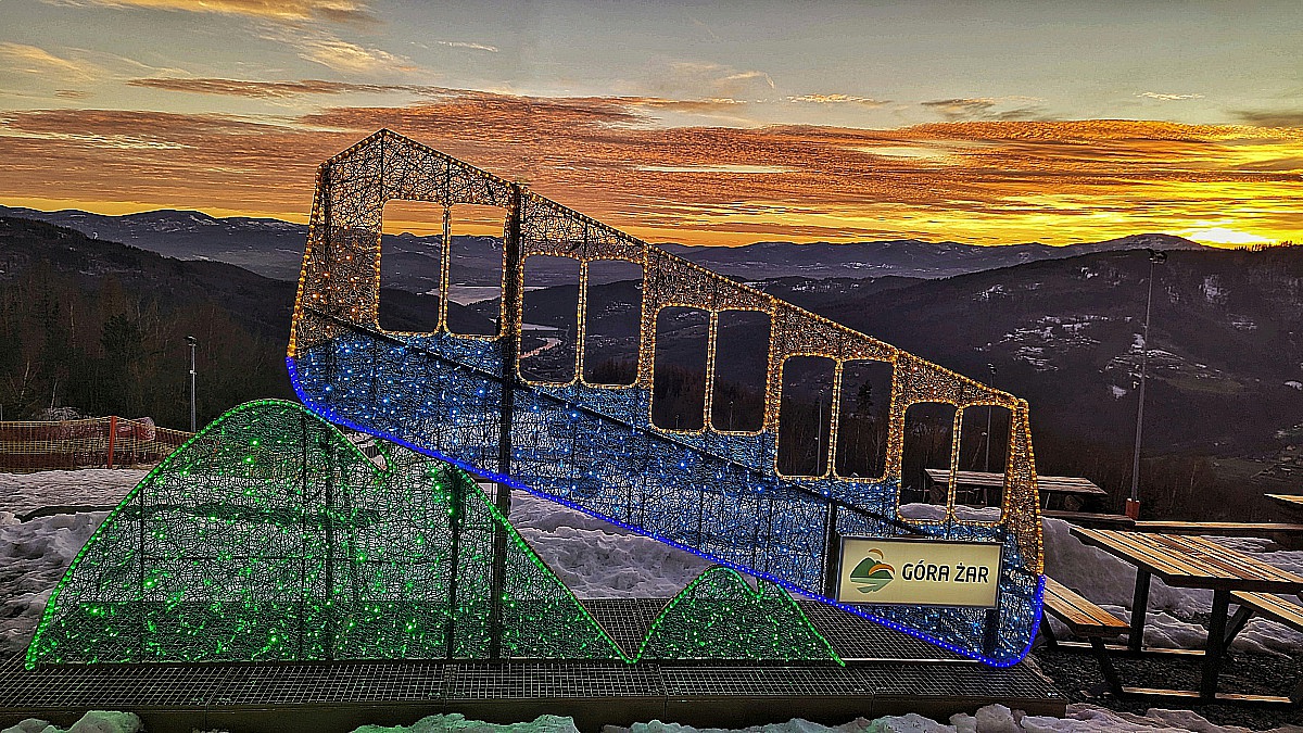 Codziennie od godz.15:00 szczyt Góry Żar rozświetla się iluminacjami rzeźb świetlnych. Swoimi kształtami nawiązują do głównych żywiołów obecnych na szczycie.