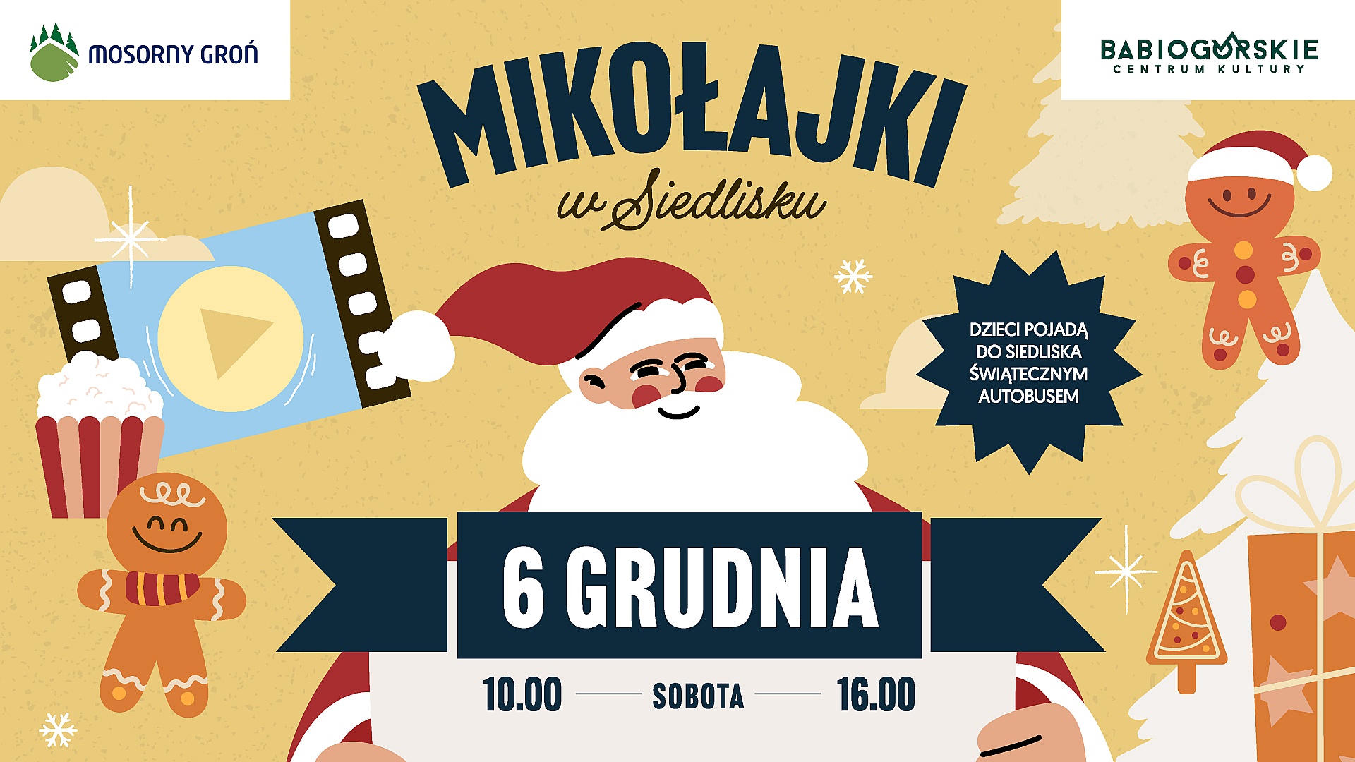 Startujemy o 10:00 pokazem mikołajkowego filmu dla dzieci w Babiogórskim Centrum Kultury, a po seansie ruszamy specjalnym świątecznym autobusem do Siedliska Babia Góra przy dolnej stacji PKL Mosorny Groń.